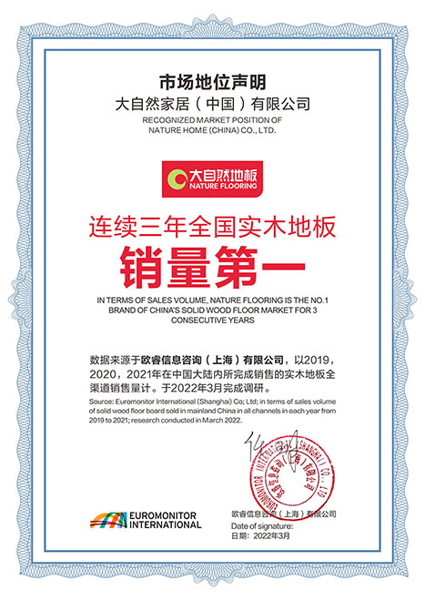 2022年3月,歐睿信息咨詢公司發布的市場調研報告顯示,在中國大陸市場全渠道銷量中,大自然實木地板從2019年至2021年,連續三年銷量第一。