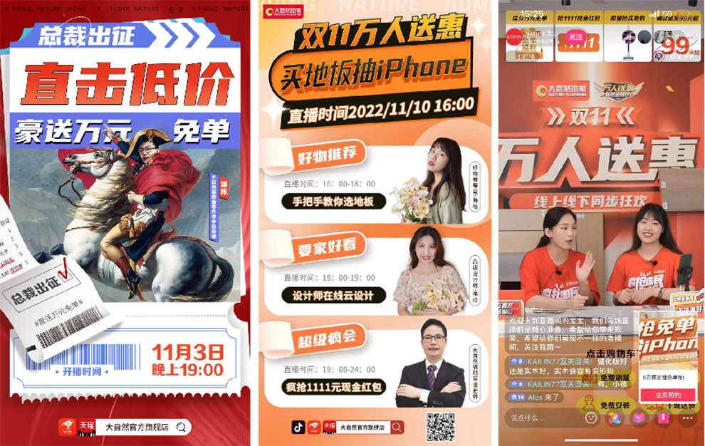 大自然家居將雙11活動提前至10月,形成“錯峰引流”態勢,以抖音+微信+天貓/京東作為營銷傳播主戰場,以節奏強勁的打法推出“圖文+視頻+軟文+直播”等營銷組合拳,以場景化的營銷模式,最大程度地吸引用戶的關注。