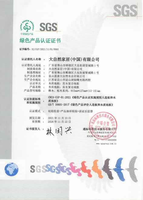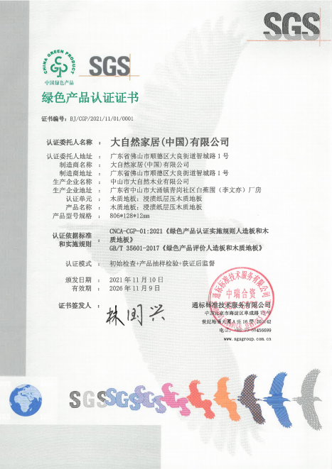 綠色建材下鄉(xiāng)對于入選產(chǎn)品有著嚴(yán)苛的審核標(biāo)準(zhǔn),入選產(chǎn)品必須是在全生命周期內(nèi)可減少對天然資源消耗和減輕對生態(tài)環(huán)境影響,具有“節(jié)能、減排、安全、便利和可循環(huán)”特征的建材產(chǎn)品。2021年,大自然強(qiáng)化地板、實木復(fù)合地板憑借環(huán)保基材和環(huán)保工藝技術(shù),經(jīng)過專業(yè)檢測機(jī)構(gòu)的層層檢測與認(rèn)證,獲得了綠色產(chǎn)品認(rèn)證證書。該證書是證明企業(yè)的產(chǎn)品在全生命周期中均符合綠色發(fā)展理念,也是綠色建材下鄉(xiāng)的重要通行證。