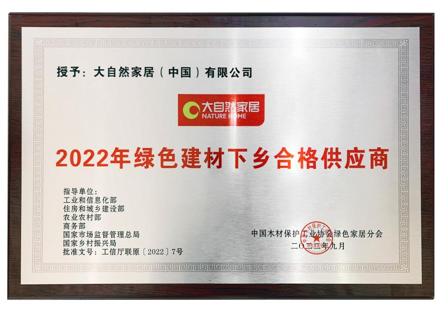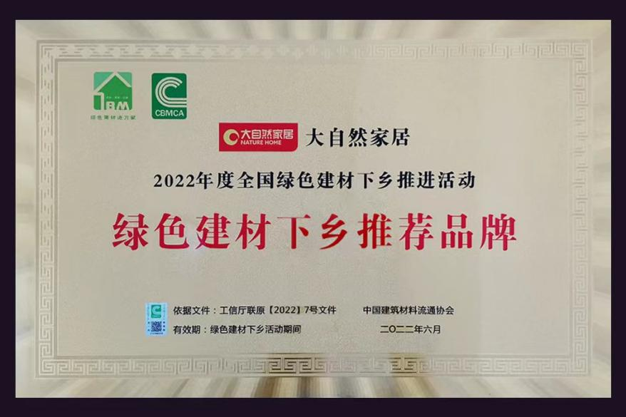 不僅如此,除了入選本次《佛山市綠色建材目錄》外,大自然家居在綠色生產(chǎn)發(fā)展道路上的成績也得到了各界的肯定。2022年6月,大自然家居入選由中國建材流通協(xié)會頒發(fā)的“2022年全國綠色建材下鄉(xiāng)推薦品牌”,而在9月7日,大自然家居再獲中國木材保護(hù)工業(yè)協(xié)會頒發(fā)的“2022年全國綠色建材下鄉(xiāng)合格供應(yīng)商”、“中國木材工業(yè)2030碳達(dá)峰發(fā)起單位”等榮譽。