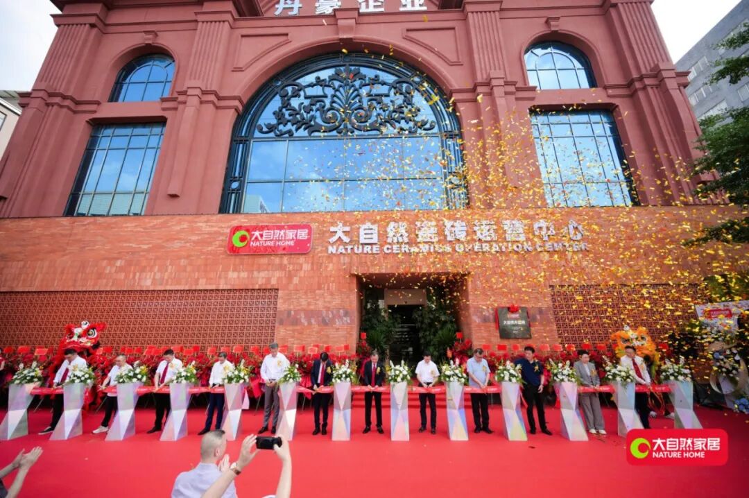 品牌啟幕剪彩儀式將現場氛圍推向高潮。企業領導與協會嘉賓十余位行業領袖共同執剪,宣告大自然木紋磚運營中心正式投入運營,為其全國市場戰略奠定了堅實的物理與品牌基石。